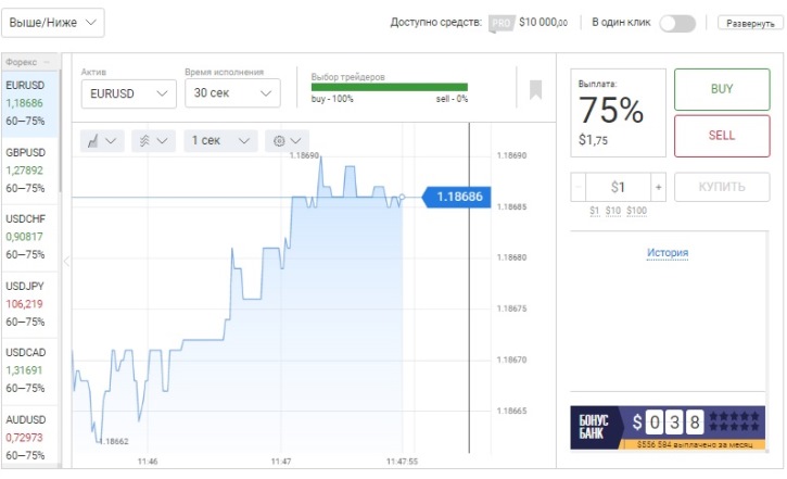 Из основных торговых условий следует отметить – сумма вложений от 1 доллара до 5000 долларов, срок продолжительности сделки от 30 секунд до 1 дня, прибыльность вложений до 100%.