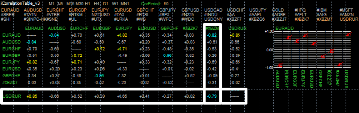 Корреляция нефть рубль До начала 2014 года о взаимосвязи между российским рублем и ценами на нефть практически никто и не догадывался. Все знали, что Российская Федерация обладает огромным сырьевым ресурсом, который на постоянной основе экспортировался в страны Европы. Однако как бы не штормило, сырьевые рынки рубль всегда прочно держался вокруг золотой тридцатки, а Центробанк полностью справлялся с удержанием валюты благодаря постоянным интервенциям. Мощь экономики России и ее огромный промышленный комплекс позволял убедить простых обывателей в стойкости рубля, Однако после начала кризиса, корреляция между рублем и нефтью стала настолько очевидна, что все граждане России почувствовали ее на собственном кармане. Причины возникновения корреляции. Техническая проверка На сегодняшний день не секрет, что власти Российской Федерации всегда закладывают цену нефти как главного источника дохода при формировании государственного бюджета. Внезапный обвал цены нефти на сырьевых рынках до 50 долларов со 130 оказался просто шоковой терапией. Для того чтобы проверить корреляцию российского рубля и нефти на сегодняшний момент мы предлагаем воспользоваться таким индикатором как iCorrelationTable_v3 который отображает уровень корреляции от -1 до 1 в таблице по разным валютным парам. Стоит заметить, что на рынке форекс рубль идет в паре с долларом, а символ выглядит как USDRUR, в то время как нефть в виде обычных фьючерсных контрактов с оплатой одного барреля нефти за доллар. Итак, вид таблицы корреляции смотрим ниже: