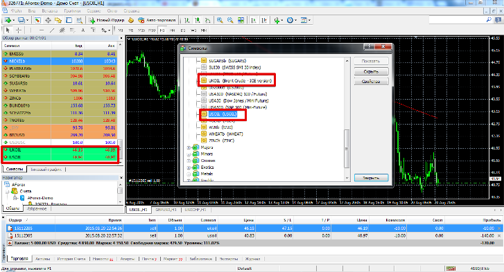 Действительно влияние цены на нефть невозможно недооценивать потому, как практически все страны в мире в какой-то степени очень зависят от цен на нефть. Например, Россия является вторым в мире экспортером по объему добычи и продажи нефти после Саудовской Аравии, а ее бюджет страны напрямую связан с курсом цен на нефть. Поэтому стремительное падение цены на нефть очень сильно сказалось на девальвации рубля. А вас никогда не посещала мысль заработать на этих скачках используя биржу? Многие новички ошибочно полагают, что на рынке форекс нет возможности торговать нефть. Конечно, в чистом виде у вас нет возможности скупать нефть вагонами, но существует такое понятие как контракты на разницу, с помощью которого и идет собственно торговля черным золотом. При загрузке и установке торгового терминала практически у любого брокера нефти нет в панели инструментов, однако вести торговлю этим инструментом можно у любого брокера (брокеры для торговли нефтью). Для того что бы добавить нефть в список инструментов наведите мышку на панель обзор рынка и нажатием правой кнопки мыши запустите список инструментов. Далее у вас появится список всевозможных инструментов которые разбиты по категориям. Обычно нефть вы можете найти во вкладке Фьючерсов или в CFD. Каждый брокер присваивает свою аббревиатуру инструменту, но чаще всего нефть сорта Brent обозначается как Ukoil, а марки WTI обозначают как Usoil. Это два основных сорта, которыми у вас есть возможность торговать. После того как вы нашли нужное обозначение просто нажмите на необходимую марку и она тут же появится у вас в панели обзор рынка. Что бы с легкостью находить контракты, которые связаны с энергетикой торговый терминал MT4 выделяет их в списке зеленым цветом.