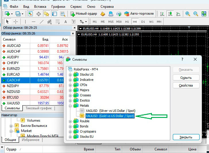 В первом случае для того, что бы заработать потребуется большая сумма денег и много времени, а во втором умение анализировать и навыки биржевой торговли. Научиться техническим моментам трейдинга вполне реально за несколько часов, программное обеспечение устанавливается как на ноутбук, планшет, так и на телефон. При этом следует отметить, что попробовать свои силы можно совершенно бесплатно на демо счете любого из брокеров. Как проходит торговля золотом на биржеНа первом этапе следует выбрать через кого вы будете осуществлять свои сделки, для этого выбираем брокера у которого имеется актив XAUUSD то есть пара золото/доллар США. Список брокеров с XAUUSD расположен на страничке - http://forexluck.ru/broker-forex/broker-metal После регистрации скачиваем программу, через которую будет производиться открытие сделок, обычно на расположена в разделе – Торговые платформы: Затем устанавливаем её на свой компьютер или телефон, планшет и приступаем к настройкам. Для того, что бы начать торговлю сначала нужно добавить актив XAUUSD в панель «Обзор рынка», сделать это довольно просто, для этого кликаем правой клавишей мышки на обзор рынка и выбираем – Символы: