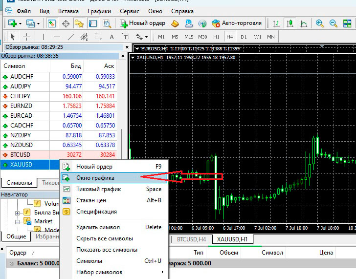 Тут активируем нужный нам актив пару XAUUSD, кликнув по ней мышкой. После этого золото появится в панели Обзор рынка и вам останется только добавить его на торговый график: Кликаем правой клавишей мышки на XAUUSD выбираем Окно графика и видим, что на графике цены появилось окошко нашего актива.