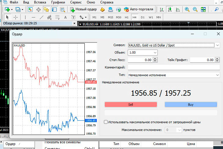 Фактически все готово для того, что бы торговать золотом на бирже, вам остается только открыть саму сделку, для этого досочно нажать F9 или выбрать в верхнем меню торговой платформы кнопку «Новый ордер»: