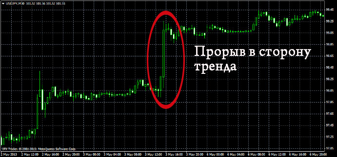 Такое явление как ценовой прорыв можно встретить на форекс довольно часто, цена, которая двигалась некоторое время в определенном ценовом канале, вдруг совершает резкое движение и пробивает границу канала.