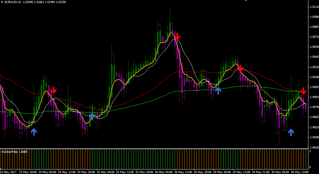 А результат теста станет основой для принятия решения об использование ее вами в будущем. Лучший брокер 2026 года. Процесс установки стратегии Joker Ma ничем не отличается от установки любой другой торговой тактики на основе пользовательских индикаторов, а именно вам потребуется сбросить скачанные файлы в соответствующие папки каталога данных платформы. Для того чтобы получить доступ к каталогу данных запустите ваш торговый терминал МТ4 и в левом верхнем углу зайдите в меню файл. В появившемся списке опций разыщите строку с названием «Открыть каталог данных» и запустите ее. Запустив каталог данных, на экране монитора отобразится список системных папок платформы, среди которых найдите папку с названием Indicators и сбросьте в нее индикаторы, а также найдите папку с названием Template и сбросьте в нее шаблон. После того как вы закроете каталог данных необходимо произвести обновление терминала либо в панели навигатор, либо путем перезапуска торгового терминала. Обновив платформу, откройте часовой график любой выбранной вами валютной пары и запустите на нем шаблон с названием Joker Ma. Вы получите вот такой график: