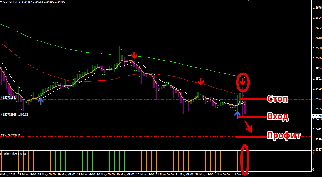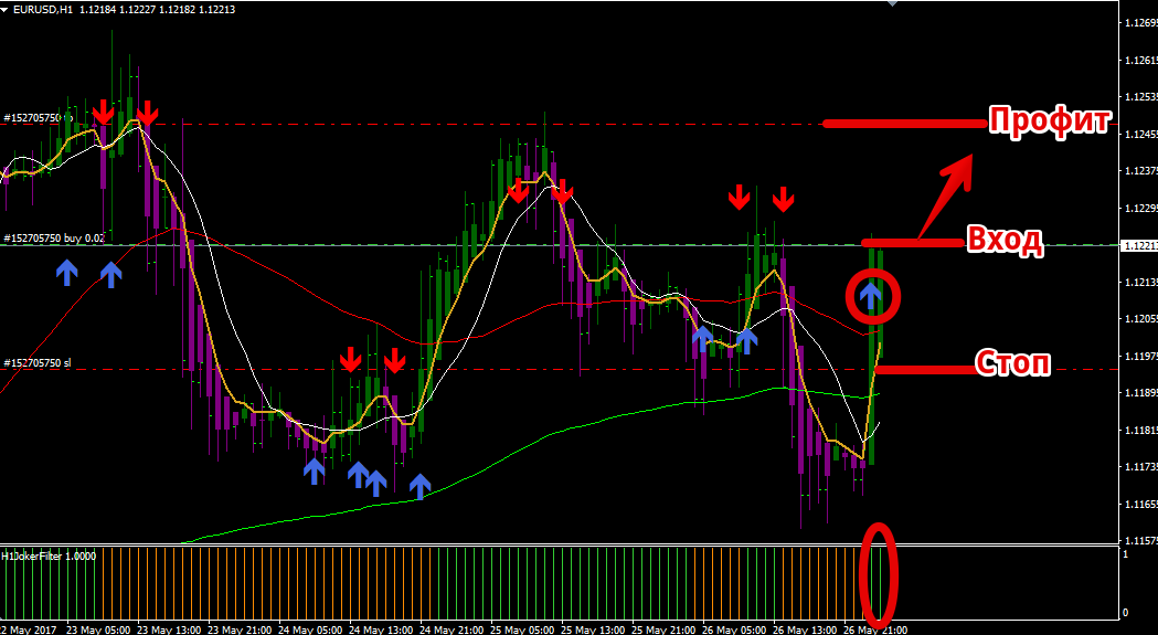Сигналы стратегии Joker Ma Торговая стратегия Joker Ma предполагает торговлю сугубо в сторону глобального тренда, который мы определяем с помощью двух скользящих средних с периодами 60 и 120 (красная и зеленая линия на графике). При восходящем тренде быстрая скользящая должна находится над медленной, а при нисходящем с точностью наоборот. Итак, давайте более детально перейдем к рассмотрению сигналов.
