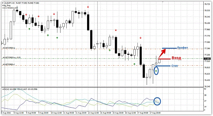 Стратегия adx тест на реальном счете Торгуя на любой валютной паре или других финансовых инструментах очень важно определить текущую тенденцию, а также своевременно реагировать на ее изменения. Как правило, для определения тенденций применяются трендовые индикаторы, особенной популярностью пользуется так называемый индикатор ADX. Многие новички по каким-то причинам избегают данный индикатор, поскольку наличие трех кривых линий порождает заблуждения насчет сложности его применения. Поэтому к применению ADX прибегают более опытные трейдеры, которые уже разбираются в его сигналах. Инструмент, был придуман Уеллсом Уайлдером еще в далеких 70 годах и стал основой сотен различных торговых тактик, поскольку именно этот индикатор с небольшим запозданием отображает смену тренда с бычьего и на медвежий и наоборот. Собственно в эффективности данного инструмента в качестве основы торговой тактики в сочетании с другими индикаторами нет сомнения, но эффективен ли adx в одиночку? Можно ли отбросить все остальные индикаторы технического анализа и положится только на ADX в процессе торговли? Для того чтобы дать ответ на все эти поставленные вопросы мы решили традиционно провести недельное испытание индикатора торгуя по его сигналам только на реальном счету. Тестирование adx на реальном счету позволяет увидеть насколько эффективен данный индикатор для трейдера при работе с реальными деньгами, где реквоты, задержки а также психологические факторы влияют на порядок больше нежели на демо счете. Однако прежде чем познакомится с результатами тестирования предлагаем познакомится со стратегией Adx которую мы применяли в процессе торговли. Торговая стратегия Индикатор ADX. Оптимизация работы Индикатор ADX является трендовым индикатором, который необходимо применять на более старших тайм фреймах. В нашем случае стратегию, которую мы будем рассматривать необходимо применять либо на часовых, либо на четырехчасовых графиках. За основу для входа в рынок берется всего две линии, а именно +DI и –DI. Принято считать, что если +DI находится над –DI, то на рынке восходящий тренд. Если же +DI находится под линией –DI, то на рынке нисходящий тренд. Зная закономерность определения тренда по индикатору ADX можно выработать простую стратегию на основе изменения тенденции, а именно пересечении двух линий +DI и –DI. Поскольку процесс тестирования в реальном времени отнимает много времени и сил, а возможность мониторить несколько графиков одновременно усложняется, мы решили применить дополнительный индикатор со звуковым оповещением ADX Crossover Arrow Alert Mail. Этот индикатор рисует стрелочку на графике, а также дает звуковое оповещение при пересечении линий +DI и –DI. Итак, давайте непосредственно к сигналам. Сигнал на покупку: 1) Линия +DI пересекает линию –DI снизу вверх. 2) Индикатор ADX Crossover Arrow Alert Mail делает звуковое оповещение и рисует стрелку вверх. Входить в рынок следует только по закрытию свечи, при этом стоп приказ устанавливаем на уровне минимума сигнальной свечи, а профит на 10-15 больше, нежели стоп приказ. Пример: