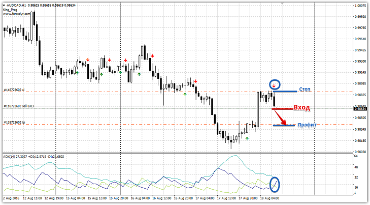 1) Линия +DI пересекает линию –DI сверху вниз. 2) Индикатор ADX Crossover Arrow Alert Mail делает звуковое оповещение и рисует стрелку вниз. После того как бар закроется непосредственно входим в позицию на продажу, при этом устанавливаем стоп на максимуме свечи, а профит устанавливаем на 10-15 пунктов больше стоп приказа. Пример:
