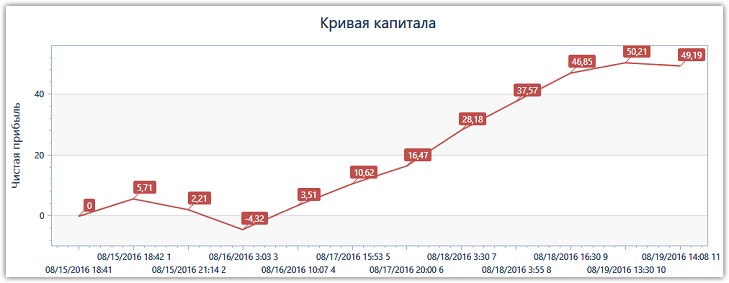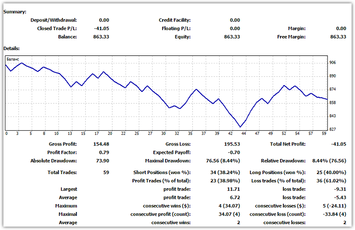 Самое интересно, что не смотря на то что индикатор трендовый и должен давать небольшое количество сигналов нами было закрыто 59 сделок, что говорит о том что в день отрабатывалось 10-12 сигналов. В процессе торговли из-за большого количества одновременно открытых сделок просадка во время торговли составила 8,4 процента. Если говорить о статистике, то 38,9 процентов ордеров были закрыты с прибылью, а все остальные по стоп приказу. Однако из-за того что кривая доходности не имеет однозначного направления можно сделать выводы, что некоторые валютные пары были прибыльны. Итак, график доходности по инструментам смотрим ниже: