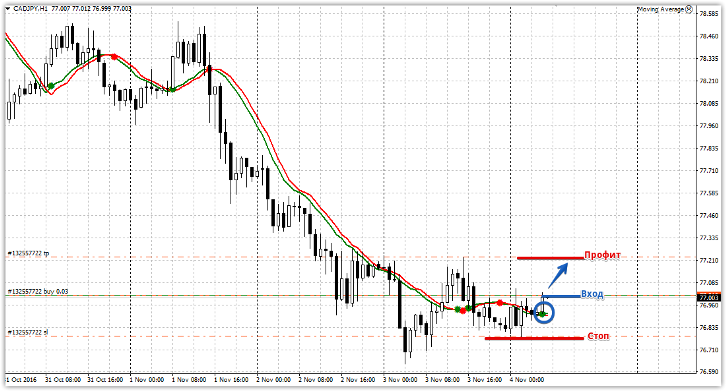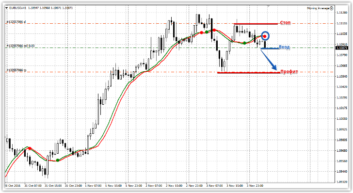 1) Зеленая линия индикатора осциллятор MA пересекает красную линию снизу вверх. 2)Появляется красная точка в момент пересечения. Как и в случае с входом на покупку очень важно дождаться, когда свеча закроется, поскольку из-за динамично изменившейся цены внутри бара сигнал может просто исчезнуть либо стать противоположным. Стоп приказ следует устанавливать у локального максимума, а профит на таком же расстоянии в пунктах, что и стоп приказ. Более детально смотрим ниже: