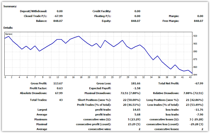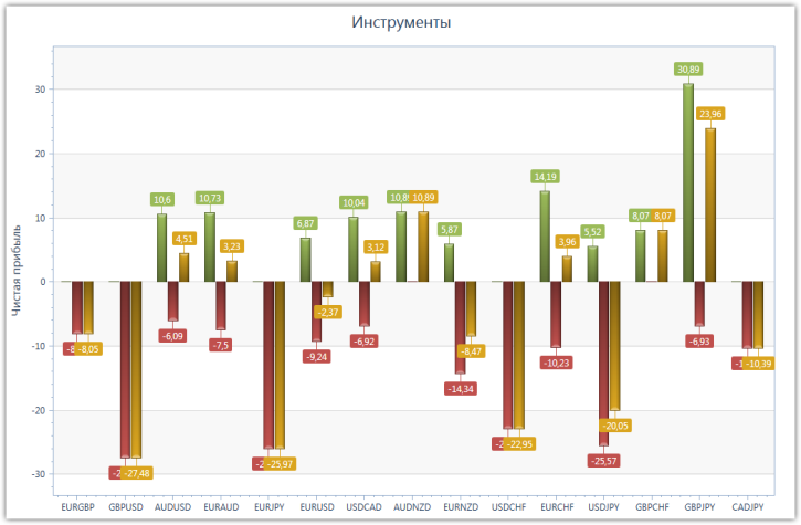 В сторону слабости стратегии указывает очень низкий профит фактор, который составляет 0.63. По итогам теста по итогам теста мы потеряли 7.4 процента. Не смотря на то, что общая картина тестирования оказалась негативной, нам не давал покоя тот факт, что стратегия на протяжении трех дней практически не приносила убытков. В виду того что было задействовано множество валютных пар мы решили сделать более глубокий анализ по инструментам, результат которого можно увидеть ниже: