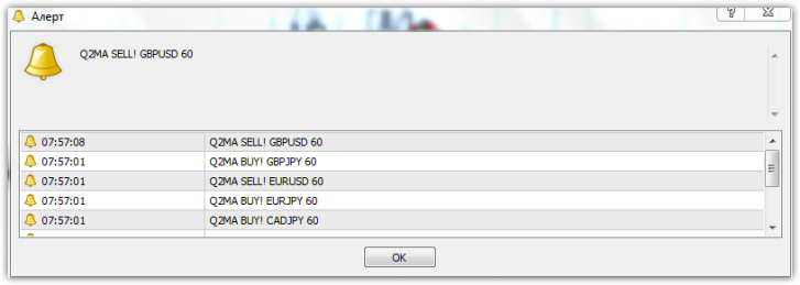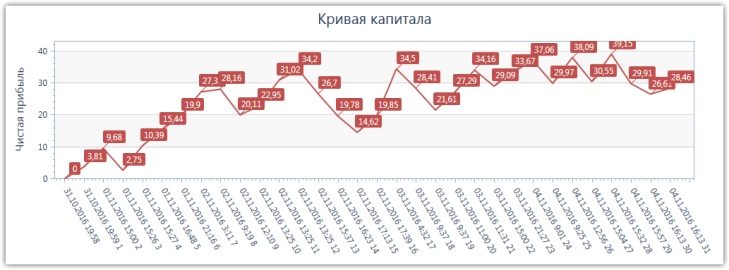 Тестирование на реальном счету проходило на протяжении ровно одной недели, а сама торговля велась на часовом графике. Поскольку стратегия отнимает много времени и не дает большое количество сигналов, мы решили применять ее на нескольких валютных парах, причем встроенное звуковое оповещение в индикаторе позволяло это делать без пропуска сигналов. В виду того что сигналы довольно часто поступали одновременно по нескольким валютным парам мы вели торговлю фиксированным лотом. Итак, результат недельного тестирования осциллятора Forex МА смотрим ниже: