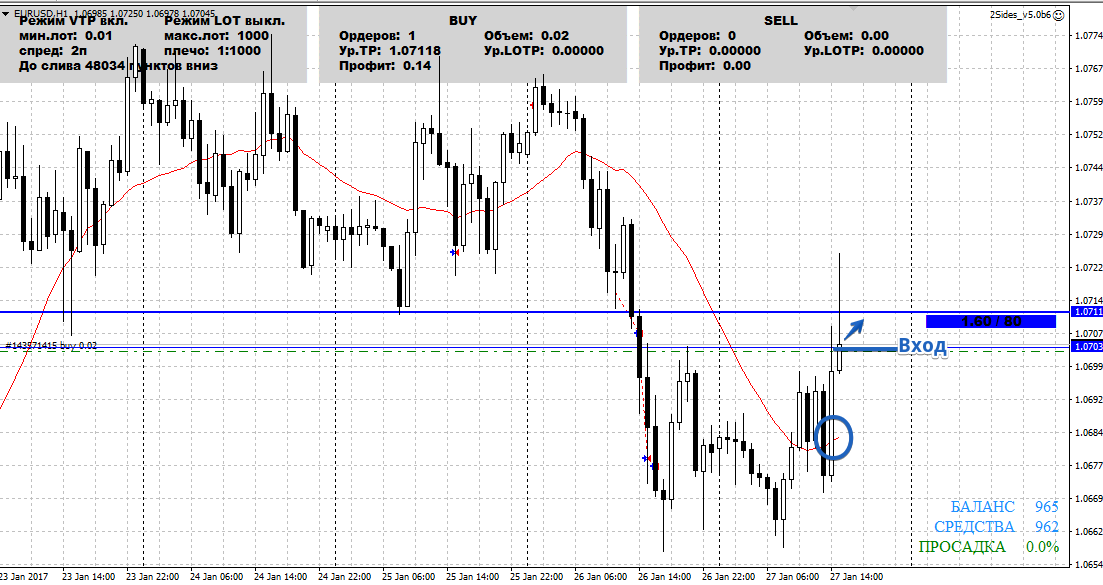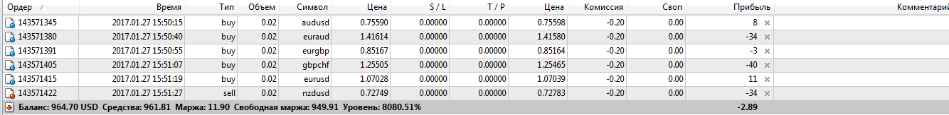Торговый алгоритм 1) Для начала в первом окне графика вам потребуется выбрать как минимум три пары валютных пар которые коррелируют между собой. По умолчанию на графике в профиле установлены такие валютные пары, которые коррелируют между собой: AUDUSD и EURAUD (обратная корреляция), EURGBP и GBPCHF (обратная корреляция), EURUSD и NZDUSD (прямая корреляция). 2) После того как вы выбрали одну из пар обратите внимание на направление скользящей средней. Если линия направлена вверх, то открываем позицию на покупку, а если вниз открываем позицию на продажу.