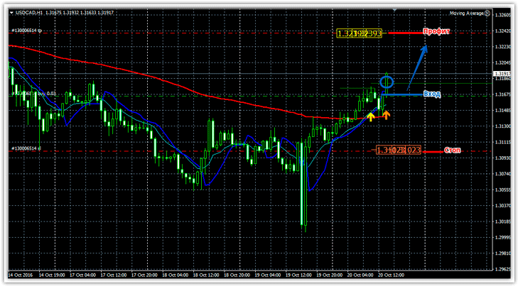 Сам вход в рынок происходил в случае одновременного соблюдения всех трех условий, причем только по закрытой свече. Профит мы устанавливали на уровне желтого указателя, а стоп приказ на уровне красного. Более детально можно посмотреть на сделку ниже: