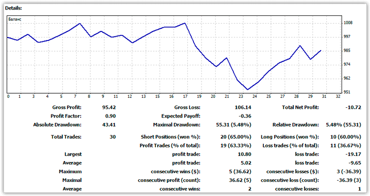 Как вы можете видеть на графике выше, неделя была отторгована практически в ноль, а если быть точнее индикатор принес убыток в размере одного процента от депозита. За подотчётную неделю было закрыто 30 сделок, просадка составила 5,4 процентов. Самое удивительное, что 63 процентов ордеров были закрыты с прибылью, когда убыточных было порядка 36 процентов.