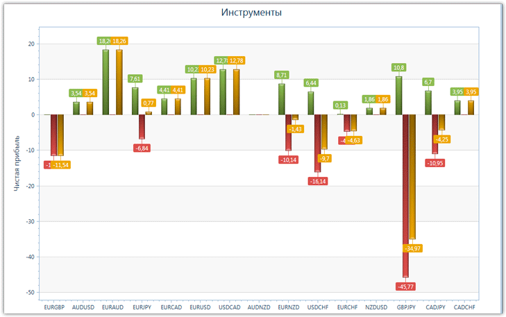 Не смотря на такое соотношение прибыльных к убыточным сделкам, мы все же получили убытки,  поскольку в процессе торговли, стоп лосс практически всегда был по размеру больше, нежели тейк профит. Так как использовалось большое количество валютных пар, предлагаем познакомиться с их эффективностью на графике ниже: