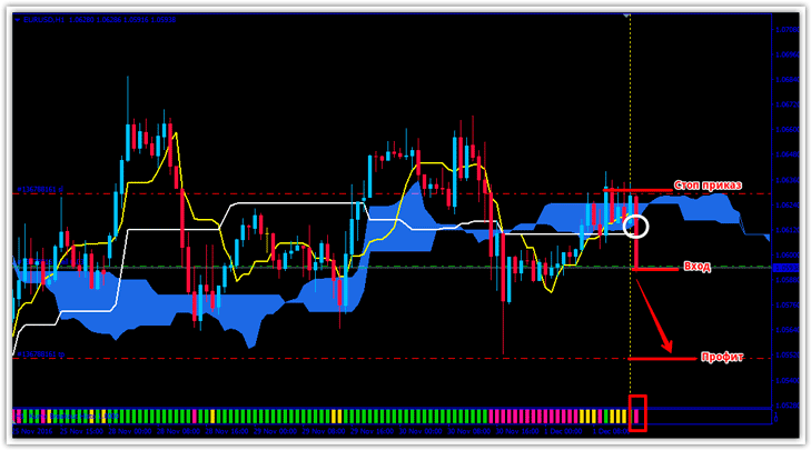 1) Цена пробивает облако Ишимоку сверху вниз и обязательно фиксируется под ним. 2) Гистограмма Kumo Breakout Histo подтверждает пробой облака и меняет цвет столбика на фиолетовый. Очень важно входить только по закрытому бару, поскольку цена после пробоя может откатиться и закрыться внутри облака, что сигнализирует о боковом рынке, а не о смене тенденции. Стоп приказ следует устанавливать либо на локальном максимуме, либо над облаком Ишимоку. Очень важно устанавливать профит не меньше стоп приказа, а желательно на пару пунктов больше. Пример: