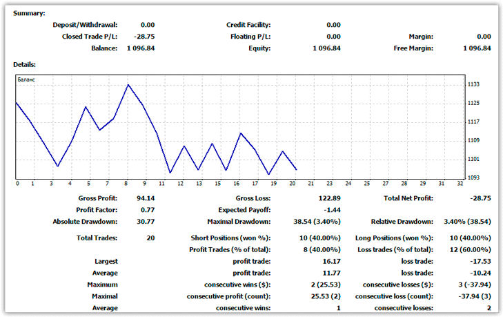 Как мы уже упоминали, тестирование проводилось на протяжении ровно одной недели. Торговля велась на часовом графике с задействованием максимального числа валютных пар, поскольку разворот тренда не такое уж частое явление. Поскольку ордера держались в среднем по 12 часов в открытом режиме, нам пришлось воспользоваться статичным лотом для упрощения расчетов позиций. Результат теста вы можете увидеть на отчете ниже: ![]() Как вы можете видеть на графике выше, тест, мягко говоря, не удался. Конечно сильных убытков мы не получили, но все же. За торговую неделю было закрыто ровно 20 сделок, причем максимальная просадка достигала порог в 3,4 процента. Если рассматривать по сделки по количеству прибыльных ордеров, то 60 процентов из них были закрыты по стоп приказу, а 40 процентов по профиту. Поскольку размер профита на пару пунктов превышал размер стоп приказа, при таком соотношении мы умудрились потерять 2,5 процента от депозита. Также стоит отметить, что низкий профит фактор в размере 0.77 указывает на нежизнеспособность стратегии. В заключение стоит отметить, что в процессе торговли мы постоянно ощущали, что сигнал сильно запаздывает и появляется всегда позже пересечения киджун-сен и тенкан-сен. Как следствие результат оказался для нас убыточным, а это значит, что мы не рекомендуем торговать на пробой Облака Ишимоку, поскольку сила этого сигнала оказалось не более чем выдумкой. Поэтому рекомендуем использовать другой, более прибыльный инструмент - http://forexluck.ru/test-st Скачать Kumo Breakout Histo |