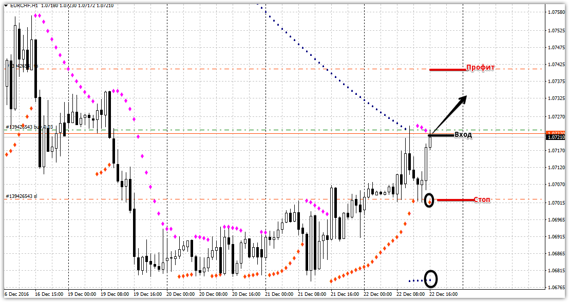 Индикатор parabolic с настройками по умолчанию отлично отображает текущую тенденцию, однако именно с этими параметрами вы не увидите глобальное направление рынка. Чтобы сбалансировать этот недостаток мы добавили еще один parabolic, однако его настройки были видоизменены для отображения глобальных трендов. Таким образом, мы получаем стратегию с входами в рынок форекс после окончания откатов в сторону глобальной тенденции. Итак, непосредственно к сигналам. Сигнал на покупку: 1)Точка медленного параболика (синий цвет) находится под ценой. 2) Индикатор Parabolic SAR Color Alert рисует желтую точку под ценой, а также дает звуковое оповещение. Вход в рынок происходит по закрытому бару, при этом стоп приказ следует разместить либо у локального минимума, либо у минимума сигнальной свечи. Профит следует устанавливать не меньше чем стоп приказ в пунктах Пример: