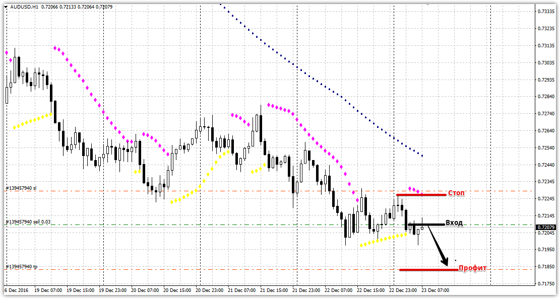 1)Точка медленного параболика (синий цвет) находится над ценой. 2) Индикатор Parabolic SAR Color Alert рисует фиолетовую точку над ценой, а также дает звуковое оповещение. Как и с позицией на покупку стоп приказ следует устанавливать либо у локального максимума, либо максимума сигнальной свечи. Выход с позиции происходит при достижении профита, который должен быть не меньше чем стоп приказ в пунктах. Пример: