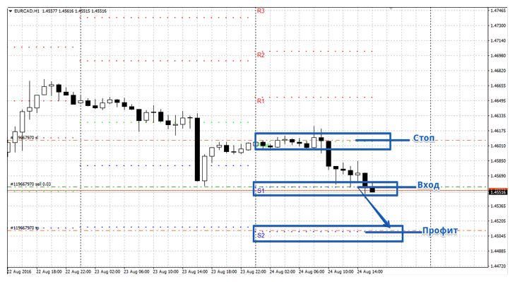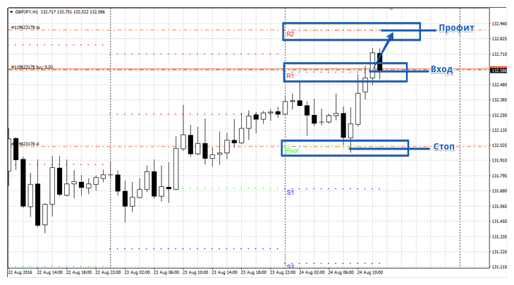 Стратегия Pivots Daily. Тестирование в реальном времени и на реальном счете Уровни Пивот являются одним из самых распространенных инструментов технического анализа, с помощью которого происходит определение ближайших целевых уровней поддержки и сопротивления. Дело в том, что весь графический анализ, а особенно построение уровней поддержки и сопротивления обладают сильнейшим недостатком – субъективностью трейдера, который выстраивает данные уровни. Многие трейдеры видят уровни там, где их попросту не существует, не говоря уже об извечном споре как правильно очерчивать уровни, по хвостам свечи или по ценам закрытия. Дабы убрать субъективность при построении уровней еще в конце 30 годов были предложены простейшие математические формулы просчета этих уровней, которые со временем были воплощены в различные индикаторы, например Pivots Daily. Активная популярность данного индикатора привела к тому, что ничем необоснованные на первый взгляд уровни стали отрабатывать себя, ведь большинство участников рынка начали брать их во внимание. Практически всем известно, что уровни поддержки и сопротивления являются базовой основой практически любой торговой тактики. Именно у этих уровней цена волшебным образом останавливается, разворачивается или, прорвав определенную отметку, набирает огромную скорость движения. Практически каждый трейдер проводя анализ, берет эти уровни во внимание. Однако нашей команде стало интересно, насколько эффективна торговля на пробой по уровням, если брать во внимание только сами уровни и ничего большего. Для того чтобы ответить на этот вопрос наша команда провела очередной тест на реальном счете, а автоматизировать процесс построение нам помогал специальный индикатор Pivots Daily. Описание стратегии Pivots Daily Принято считать, что уровни Пивот следует применять либо на часовых, либо на четырех часовых графиках. Принцип торговли по стратегии очень простой, а именно Индикатор Pivots Daily ежедневно обрисовывает центральную пивот линию, а также две поддержки и две линии сопротивления. Данные уровни выступают в качестве целей и опорных точек для входа в рынок. Для построения стратегии вам понадобится индикатор Pivots Daily который вы сможете скачать в конце статьи и установить в торговый терминал МТ4. Первоначальный сигнал, который, как правило, рекомендуют всем начинающим, строится на прорывные центральной линии и выставлении целей к первой поддержке или сопротивлению. Однако на практике цена практически постоянно находится у данного уровня и может неоднократно его пересекать, прежде чем двинутся в определенном направлении. Именно поэтому мы решили вести торговлю на пробой первых линий поддержки и сопротивления, которые при прорыве раскрывают путь к более сильным вторым уровням. Итак, давайте непосредственно к сигналам. Сигнал на покупку: 1) Цена пробивает уровень R1 снизу вверх. Вход в позицию на покупку происходит лишь после того как цена закроется и зафиксируется над уровнем R1, а не в момент пробития. Стоп приказ необходимо устанавливать на центральной пивот линии (зеленые точки) а профит на уровне R2. Более детально на картинке ниже: