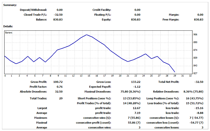 1) Цена пробивает уровень S1 сверху вниз. Непосредственно на продажу входим только после закрытия свечи под уровнем S1 и ее фиксации. Как и с позицией на покупку стоп приказ устанавливается у средней пивот линии. Профит необходимо установить на уровне S2. Более детально на картинке ниже: ![]() Ход тестирования. Результаты Тестирование проводилось по правилам стратегии, а именно на часовом графике, на протяжении одной недели. Поскольку уровни должны отрабатываться практически одинаково на всех инструментах мы вели мультивалютную торговлю. В момент, когда нам удавалось присутствовать у монитора мы открывали рыночные ордера, а когда у нас не было такой возможности мы расставляли отложенные ордера бай стоп и селл стоп у выше описанных уровнях. Результат теста можно наблюдать ниже: