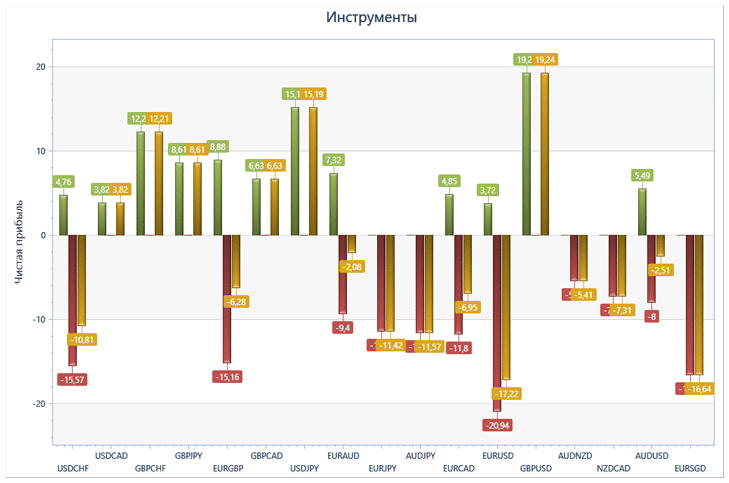 Поскольку торговля была мультивалютной, мы предлагаем познакомиться с отчетом прибыльности стратегии на различных валютных парах, что позволит выбрать эффективные и отбросить убыточные.