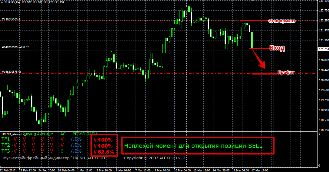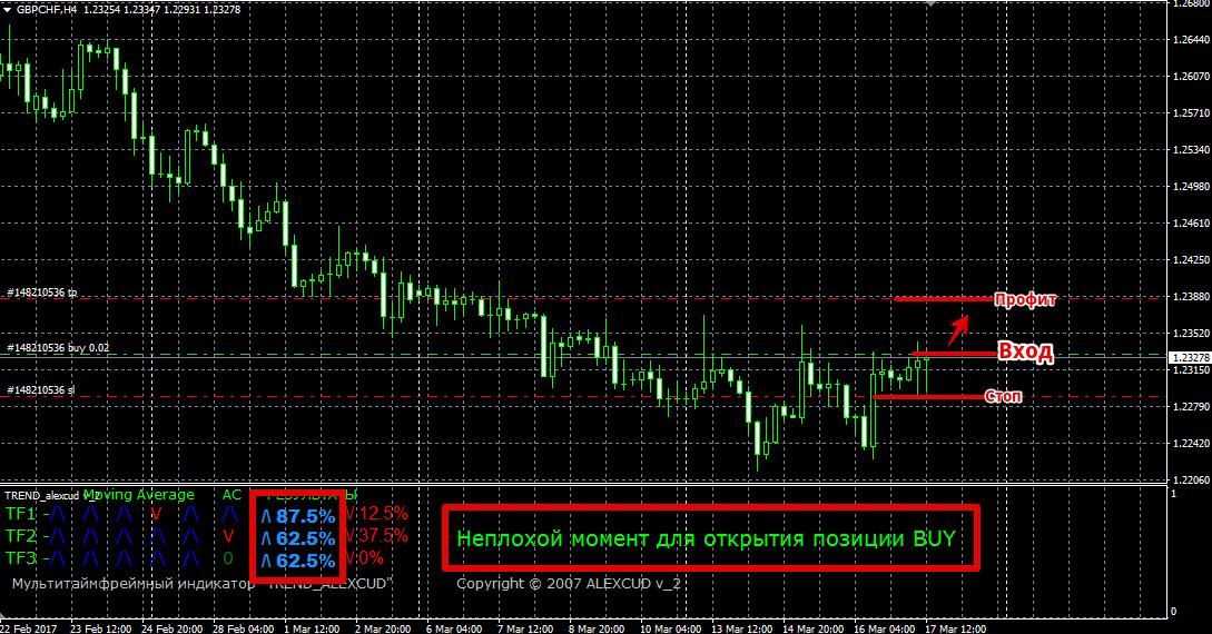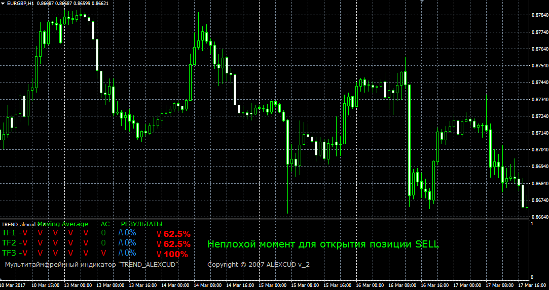 Стратегия на индикаторе trend alexcud. Скользящие средние имеют очень богатую историю применения на различных финансовых ранках, а именно начиная от товарной биржи и фондового рынка, заканчивая рынком форекс и даже бинарными опционами. Дело в том, что такой простой инструмент как скользящее среднее позволяет находить переломные моменты на рынке, определять направление тренда и более того его изменения и различные аномалии. Не смотря на то, что инструмент был создан более 50 лет тому назад, он пользуется огромной популярностью по сегодняшний день. Стоит заметить, что именно скользящее среднее стало отличной базой для создания новых более прогрессивных индикаторов, а в качестве примера можно привести trend alexcud и многие другие. Возможно, если бы не скользящее среднее то технического анализа не существовало бы как того, поскольку какой бы вы индикатор не взяли везде есть отголоски этого индикатора. Индикатор trend alexcud обладал огромной популярностью среди трейдеров в конце 2007 года, однако по пришествию времени инструмент отошёл в забвение, а сегодня мало кто из сторожил его вспомнит. Повышенный интерес у пользователей инструмент вызвал благодаря сочетанию всем привычных скользящих средних и уникального анализа тренда одновременно на трех старших тайм фреймах, который более известен как «Три экрана Элдера». Не смотря на функционал индикатора интерес трейдеров по каким-то причинам к нему погас, поэтому мы решили выяснить насколько эффективен инструмент и соответствует ли он тем требованиям, которые возводят на его трейдеры сейчас. Подготовка стратегии на индикаторе trend alexcud. СигналыДля того чтобы воссоздать стратегию, которая применялась во время теста, вам потребуется скачать и установить пользовательский индикатор trend alexcud в конце статьи.Процедура установки происходит по стандартной схеме, а именно через меню файл в вашей платформе необходимо открыть каталог данных терминала. Перед вами появится список папок, среди которых отыщите папку под названием indicators и сбросьте в нее скачанный файл индикатора trend alexcud. После перезапуска терминала откройте часовой график любой валютной пары и перетащите на нее индикатор trend alexcud. Если вы выполнили все верно, вы получите такой вид: