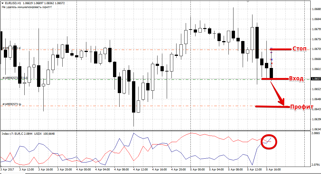Принцип применения стратегии заключается в том, чтобы сравнить два индекса которые составляют валютную пару друг с другом. В случае если доллар оказывается сильнее - синяя линия начинает расти, если слабее – падать. В момент, когда линии индексов максимально близки к друг другу – на рынке форекс флет либо силы валют практически одинаковы. В момент, когда происходит пересечение индексов появляется сигнал на вход в рынок. Сигнал на покупку: 1) Синяя линия пересекает красную сверху вниз, что знаменует слабость доллара и силу первой валюты валютной пары. После того как вы вошли в рынок необходимо установить стоп приказ на уровне локального минимума либо по минимуму сигнальной свечи. Выходить с рынка следует по профиту, который должен быть равен стоп приказу в пунктах. Пример: