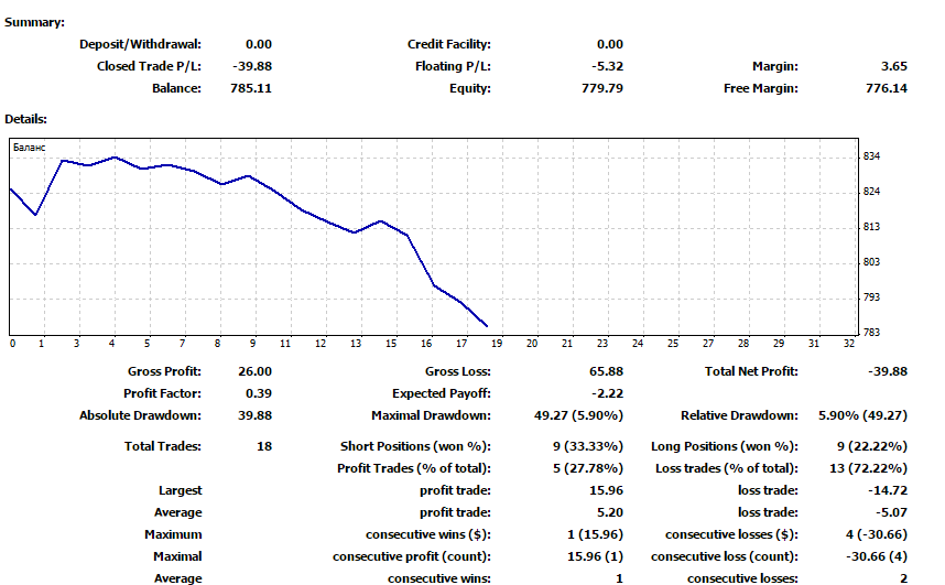 Ход тестирования. Результаты ст. на 3ColorMACDЕсли вас интересует теоретическая основа организации сделок по данной стратегии читайте ее в первой части статьи - http://forexluck.ru/test-st/91-test-st/2807-st-3colormacdТестирование стратегии происходило ровно на протяжении одной торговой недели. Поскольку тактика имела явно трендовое направление, а сигналы появлялись крайне редко, нами было задействовано множество валютных пар. Сам торговый процесс происходил только на часовых графика, а поскольку в рынке находилось по несколько открытых ордеров одновременно, торговля велась статичным лотом. Итак, результат тестирования смотрим ниже: ![]() Как вы можете видеть из отчета выше, стратегия, к сожалению, не оправдала наши ожидания. За одну торговую неделю нами было закрыто 18 сделок и лишь 5 оказались прибыльны, в то время остальные 13 были закрыты с убытком. В сторону неэффективности торговой тактики указывает как низкий профит фактор, который составил 0,39 так и серийность торговой тактики, а именно на каждые 3-4 лося лишь й прибыльная сделка. В заключение стоит отметить, что популярная модификация стандартного индикатора MACD оказалась попросту непригодной для использования в качестве сигнального инструмента. Именно поэтому мы не рекомендуем применять стратегию на индикаторе 3ColorMACD на реальном счете. Скачать шаблон индикатор 3ColorMACD |