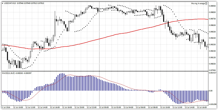 Тест стратегии на базе MACD Индикатор MACD является неотъемлемой частью сотен различных торговых тактик, причем неважно, какой сталь практикует трейдер, ведь MACD успешно применяют как в скальпинге, так при долгосрочной торговле. Собственно осциллятор MACD настолько пользуется популярностью, что даже трейдеры которые предпочитают вести торговлю на новостях наносят данный инструмент, дабы подобрать более выгодную точку входа в рынок. Как правило, в стратегиях MACD выполняет функцию сигнального индикатора, причем применяются как разворотные сигналы, так и базовые. С одной из таких стратегий, которая учитывает оба типов сигналов повстречалась и команда нашего сайта, поэтому мы приняли решение провести недельное тестирование на реальном счету стратегии на базе MACD. Описание стратегии на базе MACDВ основе стратегии, которая подверглась нашему усиленному тестированию, лежит три индикатора, а именно MACD, Moving Average и Parabolic Sar. Стоит отметить, что все индикаторы кроме Moving Average с периодом 100 применяются по умолчанию, поэтому вы можете установить данную стратегию путем нанесения данных инструментов на график валютной пары.Также мы подготовили шаблон и разместили его в конце статьи, установив который после запуска вы получите готовую тактику. Чтобы произвести установку получите доступ в каталог данных терминала и найдите папку Template. Далее сбросьте скачанный файл в данную папку и запустите шаблон. После запуска вы должны получить такой график: