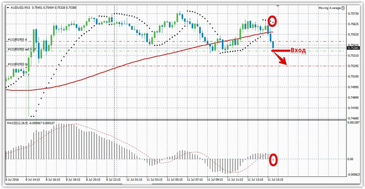1)Гистограмма MACD пробила уровень 0 сверху вниз. 2) Цена находится под MA с периодом 100. 3) Точка индикатора Parabolic над ценой. При установке стоп приказа стоит обратить внимание либо на максимум сигнальной свечи или на локальный максимум. Профит устанавливаем равный стоп приказу. Пример: