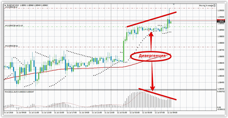 Дивергенция считается довольно сильным сигналом, однако входить в рынок необходимо при ее подтверждении в виде повышающегося или понижающегося столбика гистограммы. Прим подобной сделки смотрим ниже: