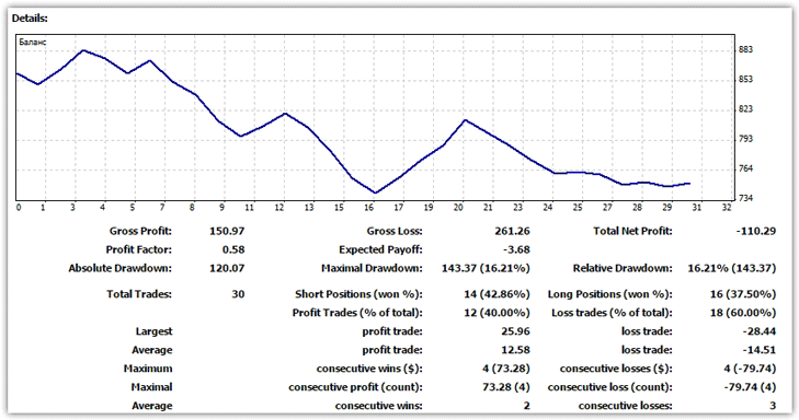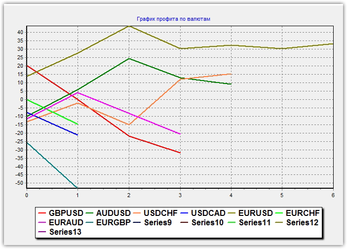 Если говорить об общем количестве сделок, то их было порядка тридцати, а самый главный показатель прибыльности стратегии профит фактор составил всего 0.58. Поскольку мы вели торговлю мультивалютную, предлагаем познакомиться с графиком результативности по валютным парам: