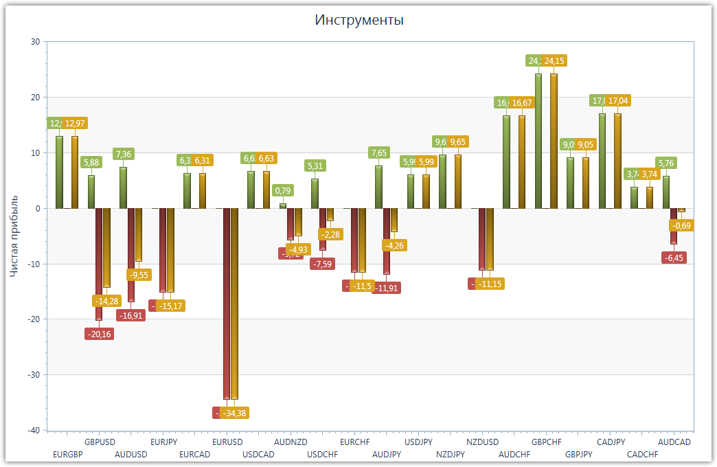 Однако кросс-курсы, наоборот, в подавляющем большинстве своем принесли прибыль. Если бы мы вели торговлю сугубо по кросс-курсам, то мы бы получили такой результат: