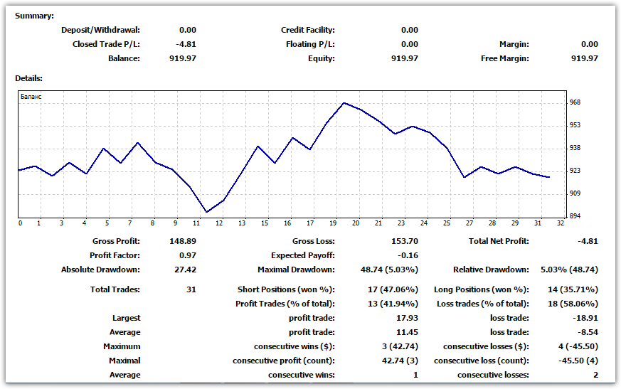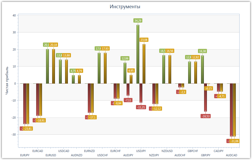 Если разобрать структуру сделок, то выясняется, что лишь 13 ордеров из общего числа оказались прибыльными, когда остальные 18 были закрыты с убытком, Если говорить о просадке, то она находилась в пределах пяти процентов. К сожалению, стратегия показала крайне низкий профит фактор, а именно 0.97. В виду того что торговля была мультивалютной мы предлагаем познакомиться с эффективностью стратегии на каждой валютной паре по отдельности: