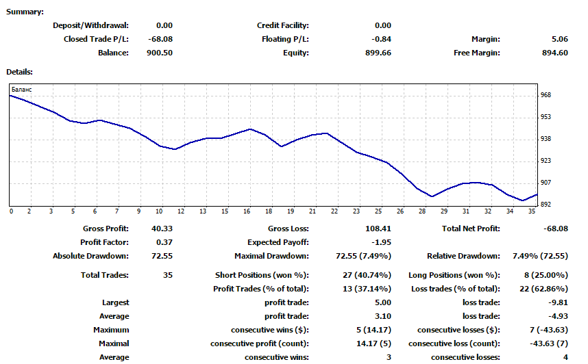 Собственно кривая баланса говорит за себя. Также стоит отметить подверженность стратегии к серийности, а именно для данной тактике в пределах нормы закрытие семи убыточных сделок в подряд и пяти с прибылью в подряд. К сожалению выбранная нами тактика оказалась очень убыточна, что подтверждает очень низкий профит фактор, который составил всего 0.37. В общем, за торговую неделю нами было потеряно 7 процентов от депозита. В заключение нам остаётся констатировать тот факт, что торговля, основываясь на закономерностях в коррекции довольно губительна для вашего депозита, если в качестве главного индикатора для поиска точки окончания отката использовать индикатор Bollinger Bands. Поэтому если вы решитесь использовать данную тактику, обязательно прикрепите к Bollinger Bands как минимум дополнительный фильтр. |
