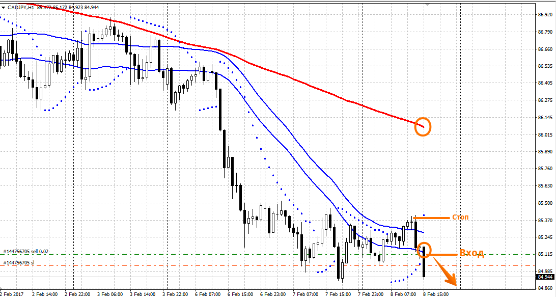 1) Цена находится под красной линией скользящей средней с периодом 125. 2) Цена пробивает две скользящей с периодом 34 сверху вниз и фиксируется под ними. 3) В момент пробоя ценой скользящих, точка индикатора Parabolic Sar должна находится над ценой. Как и с позицией на покупку входить в рынок следует после закрытия свечи. Очень важно ограничить риски на уровне локального максимума либо по точке индикатора параболик. Для того чтобы взять максимальный потенциал рынка мы не устанавливаем профит, а вместо него следует выбрать трейлинг стоп в 10 пунктов. Более детально смотрим на изображении ниже: