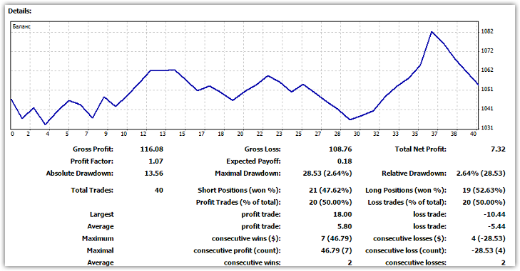 Сам тест проходил на часовом графике, на протяжении одной недели. Не смотря на то, что консолидация встречается практически ежедневно, причем в основном по утрам по окончанию азиатской торговой сессии в процессе торговли мы задействовали максимальное число валютных пар, дабы объективно посмотреть на стратегию и ее эффективность. Поскольку сигналы зачастую возникали одновременно на нескольких валютных парах, торговля велась все время статичным лотом. Итак, результат торговли за неделю смотрим ниже: