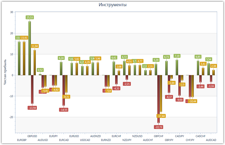 Если говорить об прибыльных сигналах, то их количество составляет ровно 50 процентов, а также 50 процентов убыточных. Стремительные кривые роста и падения указывают нам на то, что ордера с прибылью или убытками закрывались серий. Из отчета отчетливо видно, что был зафиксирован случай в семь закрытых подряд сделок с прибылью и четыре с убытком. В негативную сторону и направлен профит фактор, который составляет 1.07. Однако, не смотря на низкие показатели, неделя была закрыта с прибылью, пусть и незначительной. В виду того, что стратегия была мультивалютной и в процессе торговли было задействовано множество валютных пар мы можем проанализировать инструмент которые работают, а которые нет. Итак, эффективность по валютным парам можно увидеть ниже: