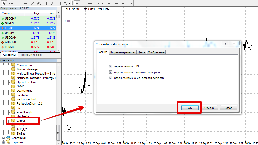 Лучший брокер 2026 года. Дело том, что в виду особенностей появления свечи стандартные графики обладают очень сильной шумностью. Огромное количество свечек, которые имеют небольшие тела, но при этом каждый раз появляются по времени, создают волны ценового шума, который сбивает трейдеров с толку, не давая отчетливо рассмотреть тенденции. Также из-за особенностей построения графика происходит такое явление как запаздывание сигналов индикатор, которые формируются на основе закрытого бара. Собственно по этой же причине появилось такое явление как перерисовка сигналов. Единственный путь решения подобной проблемы – это отвязка формирования графика от временного интервала. Подобные решения реализованы в виде графиков Ренко и Каги, однако из-за нестандартного их внешнего вида и слабой информативности многие отказываются применять их на практике. Именно поэтому были созданы синтетические бары, которые визуально ничем не отличаются от обычных баров, но при этом они отвязаны от тайм фрейма. Индикатор synbar – это вспомогательный инструмент технического анализа, который позволяет генерировать синтетические бары на основе стандартных графиков в режиме реального времени. Примечательной особенностью индикатора является возможность генерации графика в двух режимах, а именно статического и динамичного, что позволяет использовать полученные данные, как в режиме реального времени, так и для исторического тестирования. Индикатор synbar может генерировать синтетические бары для любого торгового актива присутствующего в МТ4, поэтому индикатор можно считать мультивалютным. Установка Synbar. Генерация синтетических баров Индикатор Synbar – это вспомогательный инструмент, который позволяет расширить базовый функционал торгового терминала МТ4. Ввиду того что инструмент является пользовательской разработкой вам потребуется выполнить скачивание индикатора в конце статьи, после чего установить его в торговый терминал МТ4. Установка индикатора Synbar происходит по стандартной схеме и ничем не отличается от установки любого другого пользовательского индикатора, а именно вам потребуется сбросить скачанный ранее файл индикатора synbar в соответствующую папку каталога данных терминала. С более детальной инструкцией по установке индикаторов в торговую платформу можно познакомиться по ссылке http://forexluck.ru/sov/813-ustanovka-sovetnik. После обновления торгового терминала в панели навигатор либо после перезапуска Synbar появится в списке пользовательских индикаторов, а для того чтобы начать генерировать синтетические бары перетащите название инструмента на минутный график актива, по которому вы хотели бы получить отдельный график.