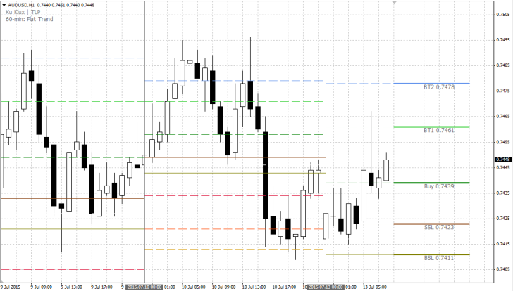 На первый взгляд индикатор напоминает уровни Мюрея или линии поддержки или сопротивления. Однако это не так. Индикатор строит из восьми линий, которые показывают нам точки входа и выхода с позиции. Прежде чем рассматривать сигналы, которые дает нам индикатор, поговорим о настройках индикатора. В строке Level_Width вы можете сменить толщину линий, которые отображены на экране. Для этого укажите значение от 1 до 5. В строке Text_Font_Size можно изменять размер шрифта путем изменения значений от 8 до 16. Для большего удобства вы можете сместить уровни влево или вправо путем изменения в строке Level_Text_Shift количества баров. Строка Show Daily Open отвечает за белую пунктирную линию, которая является открытием дня. В строке Number of Days вы можете задать количество дней, на которых будет отображаться показания индикатора. Максимальное количество является 22 дня. Этот параметр особо важен, поскольку он поможет вам проанализировать на истории прибыльность индикатора. В строке Daily Open Setting вы можете изменить точку отсчета данных уровней. Например, если вы поставите 1 –расчет уровней будет происходить по открытию дневной свечи у вашего брокера. В настройках индикатора напротив каждой цифры есть значение по времени и торговой сессии. А теперь кратко по сигналам. Торговля по Ku Klux происходит с помощью отложенных ордеров бай стоп и селл стоп. Выставляем уровень бай стоп по зеленой линии Buy, а сел стоп по красной линии Sell. Стоп приказ устанавливаем для ордера бай стоп на уровне со значением BSL, а для отложенного ордера сел стоп лося ставим на уровне под названием SSL. Таким образом, мы имеем четко сформулированную торговую стратегию. Для полного понимания смотрим пример на картинке: